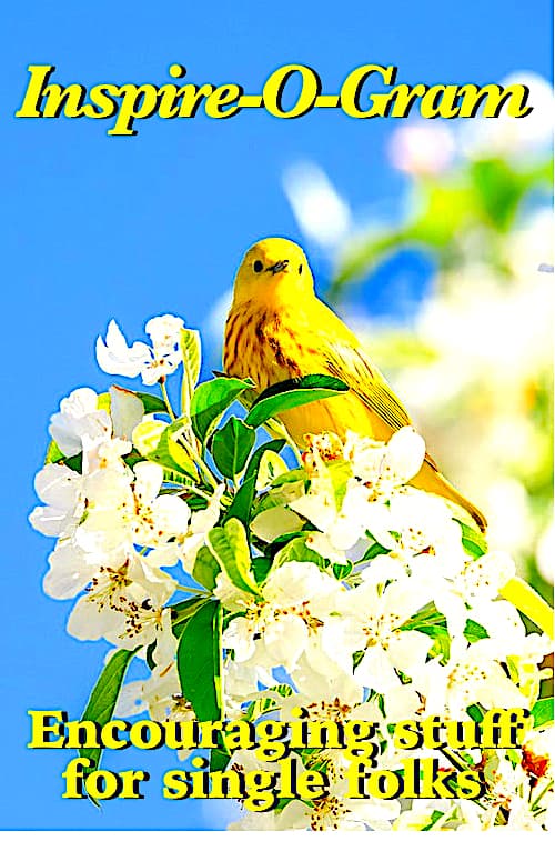 Here are the requests for March: Natalie: Freedom from pride, anger, despondency, shame and depression. Dawn: God's guidance for the President & national leaders. Lisa: Physical healing for her brother. Jenny: Emotional healing. Cherlyn: Physical and emotional healing. Want to get on the prayer list or make a comment on this newsletter? Use our secure Contact Form. and your email will route directly to my personal inbox. That concludes the March Inspire-O-Gram. Thank you for reading. This single life is a complicated, challenging path, but we Christians have a clear-cut goal: to honor and glorify Jesus Christ. Until April, happy Easter, and God bless you!